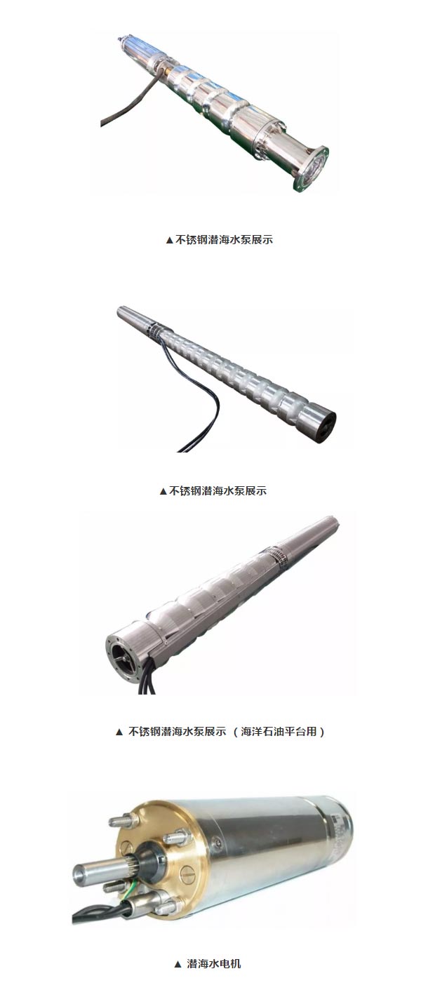 該公司生產(chǎn)的潛海水泵多用于滿足海洋石油平臺(tái)的消防,海水抽取及冷卻需求等,接受貼牌生產(chǎn)及客戶定制。材質(zhì)范圍包括:不銹鋼304/316/316L/雙相鋼/錫青銅及更高材質(zhì)要求。產(chǎn)品通過(guò)認(rèn)證CE,CCS,ABS,DNV。