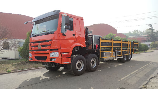 該車主要采用載貨汽車底盤,加裝副車架、起重架(選裝)、牽引鞍座、取力裝置、液壓系統(tǒng)、液壓絞車、起升系統(tǒng)等構(gòu)成,能夠?qū)崿F(xiàn)撬裝設(shè)備拖運(yùn)、起重和牽引多種功能,結(jié)構(gòu)新穎、使用便捷,可大幅降低鉆井公司的搬遷費(fèi)用, 提高經(jīng)濟(jì)效益,增強(qiáng)市場的競爭力。