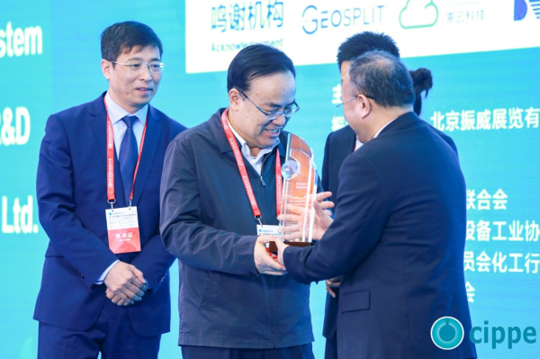 全國(guó)政協(xié)常委、中國(guó)石油大學(xué)(北京)校長(zhǎng)張來斌為獲獎(jiǎng)企業(yè)頒發(fā)cippe“展品創(chuàng)新金獎(jiǎng)”