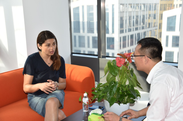 羅馬尼亞議會(huì)眾議院外交顧問(wèn)Popa Diana-Melania女士(左)與振威員工交流(右)